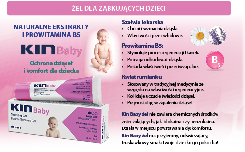 KIN Baby żel. Żel oparty wyłącznie na naturalnych ekstraktach i prowitaminie B5. W skład naszego żelu wchodzą kwiaty rumianku, które stosowane są w naturalnej medycynie ze względu na swoje właściwości regeneracyjne. Kwiaty rumianku koją i dają uczucie świeżości dziąseł. Przynoszą ulgę w zapaleniu dziąseł. W składzie KIN Baby żel znajduje się również szałwia lekarska która chroni i wzmacnia dziąsła. Ma również właściwości przeciwbólowe. Natomiast prowitamina B5 zawarta w naszym żelu stymuluje proces regeneracji tkanek, pomaga odbudować dziąsła i posiada właściwości przeciwzapalne. Jednym słowem KIN Baby żel zapewnia ochronę dziąseł i komfort dziecku podczas wyrzynania się pierwszych ząbków. Nasz bezpieczny żel na ząbkowanie ma przyjemny, odświeżający truskawkowy smak, który na pewno przypadnie do gustu Twojemu dziecku. A co najważniejsze KIN Baby żel nie zawiera cukru ani chemicznych środków znieczulających, jak lidokaina czy benzokaina.
